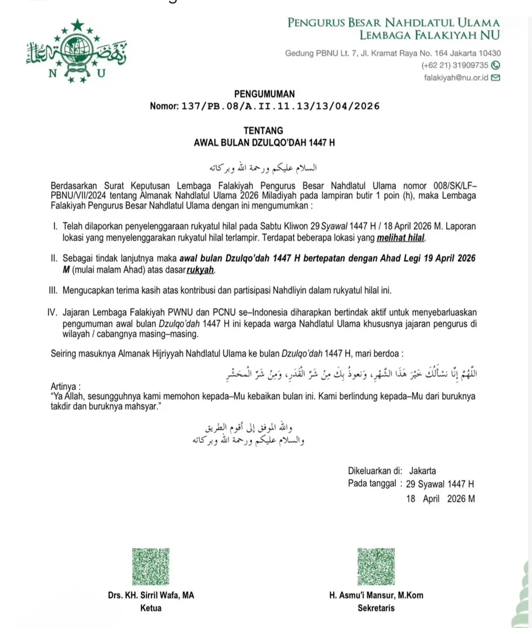 Dalam surat yang ditandatangani Ketua LF PBNU KH Sirril Wafa dan Sekretaris Asmu’i Mansur, tertanggal 18 April 2026, disebutkan, berdasarkan Surat Keputusan LF PBNU nomor 008/SK/LF-PBNU/VII/2024 lampiran butir 1 poin (h), LF PBNU mengumumkan, telah dilaporkan penyelenggaraan rukyatul hilal pada Sabtu Kliwon, 29 Syawal 1447 H/ 18 April 2026 Masehi.’’Terdapat beberapa lokasi yang melihat hilal,’’ bunyi poin pertama pengumuman tersebut, Ahad (19/4/2026) pagi.